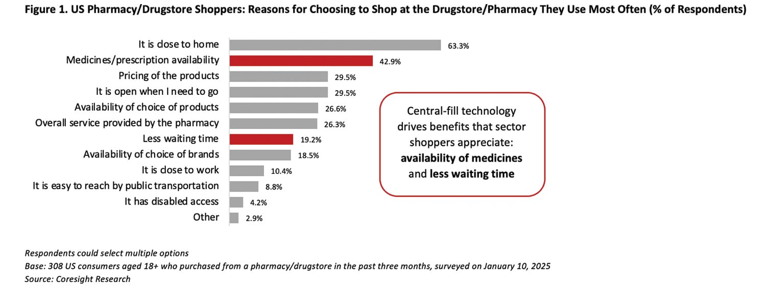 • Prescription fulfillment technology: central fill — AI is transforming pharmacy operations by automating routine tasks, easing administrative burdens and allowing pharmacists to focus more on patient care. However, many potential in-store automation technologies — such as robotics — are costly and currently limited by safety regulations. As a result, retailers are instead investing in central-fill facilities where automation can be fully leveraged to improve efficiency and enable pharmacists to provide more personalized service.