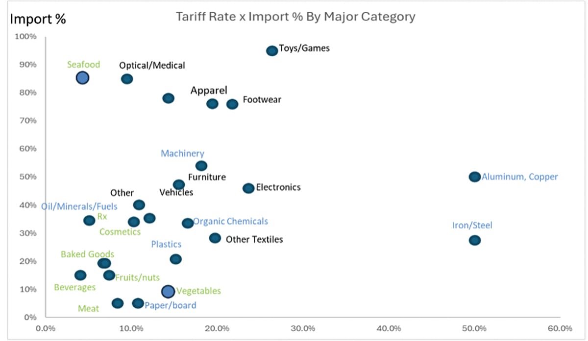 Retail Cities puts together a tariff intensity chart by category that looks at the tariff rate by country, depending on country of origin and the percent of the category that are imports. What is quickly apparent are that tariffs are largely in two areas: