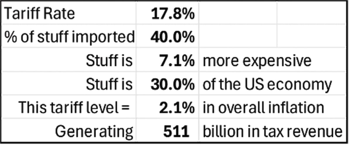 This keeps the impact of this level of tariffs to a relatively manageable 2.1% change in the price of things in the economy overall.